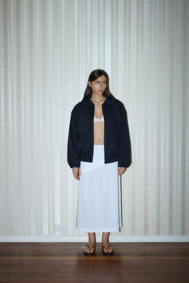 a padded bomber-style jacket featuring a boxy fit with two bow tie details. elasticated hemline with silver press stud belt feature, hidden side seam pockets, elasticated cuffs, and a zip placket under a padded layer